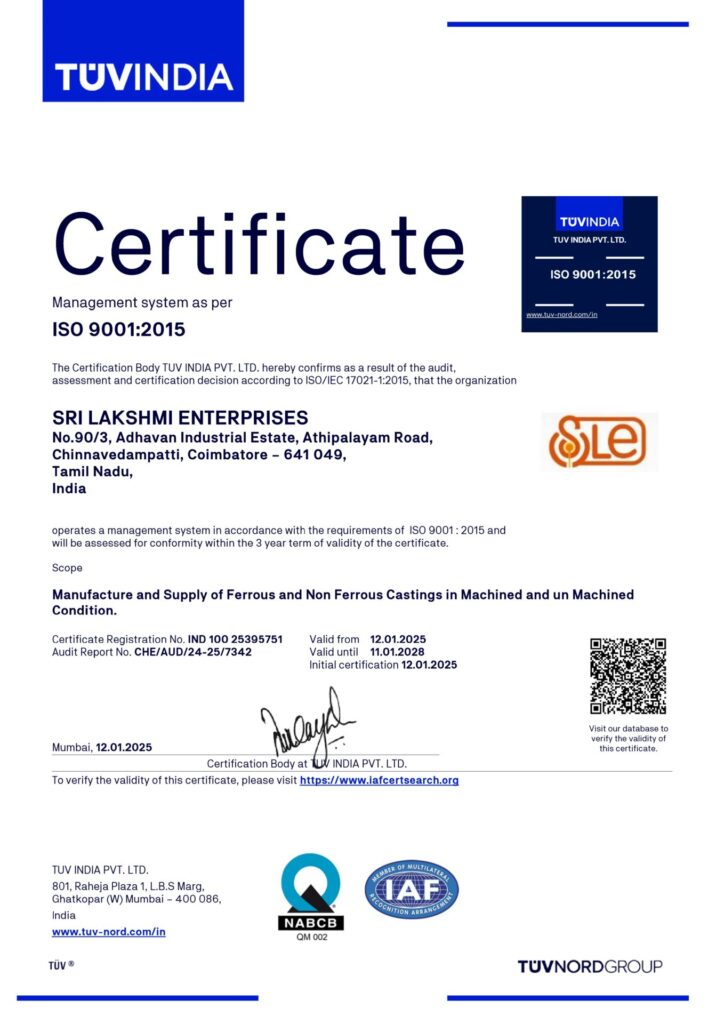 We are proud to be an ISO 9001:2015 certified company, recognized for our commitment to quality management and excellence in manufacturing. This certification reflects our dedication to maintaining international standards in the manufacture and supply of ferrous and non-ferrous castings in both machined and un-machined conditions. Our certification is a testament to the rigorous processes, advanced infrastructure, and continuous improvement that define our work, ensuring that every product we deliver meets global quality benchmarks.